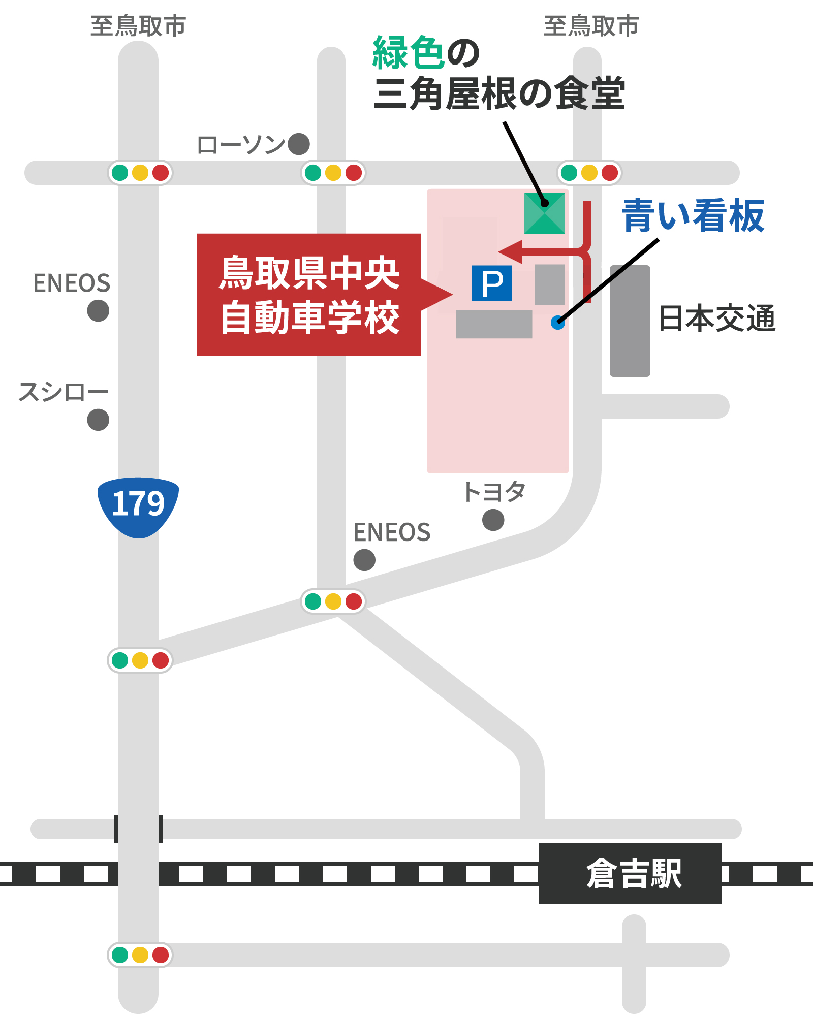 鳥取県中央自動車学校の青い看板を過ぎて、緑色の三角屋根の食堂のすぐ手前からお入りください。