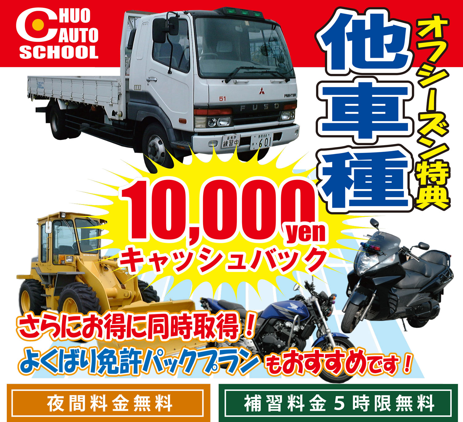 - 技能教習補習料金は、対象車種すべて5時限まで無料。
